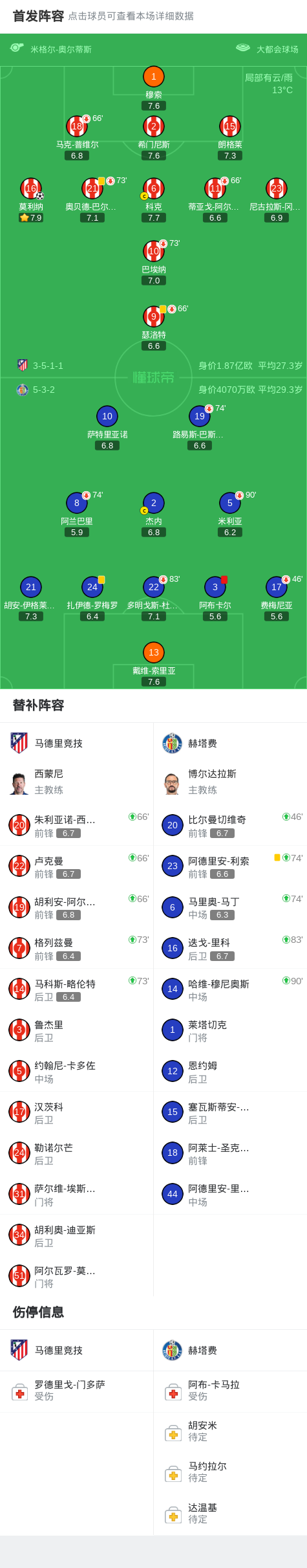 北京时间3月14日西班牙足球甲级联赛 联赛 第28轮,马德里竞技主场对阵赫塔费。上半场莫利纳轰出无解世界波。下半场阿布卡尔抓瑟洛特裆部后被拽倒,裁判回看后向前者出示红牌,后者黄牌。最终马竞1-0战胜十人赫塔费。